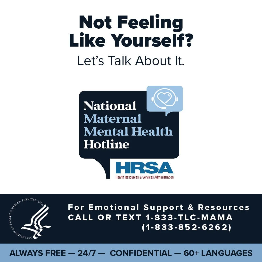 Call or text the National Maternal Mental Health Hotline 833-852-6262. Hotline Counselors are available to discuss and explore next steps for you and your loved one. Available 24/7, in the United States only.